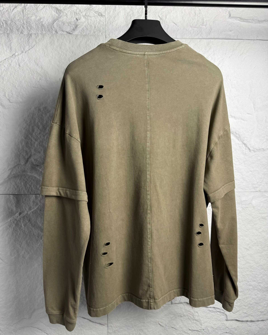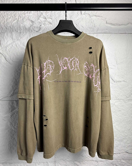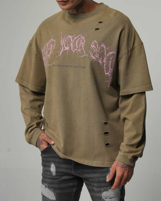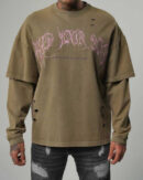 Уникален streetwear модел в износен черен цвят с двойно-слоен ефект, създаващ впечатление за комбинирани две дрехи. Дизайнът е вдъхновен от урбан културата и съдържа bold принт в стилизиран шрифт с графичен акцент. Материята е мека, плътна и с washed ефект, придаващ винтидж визия.